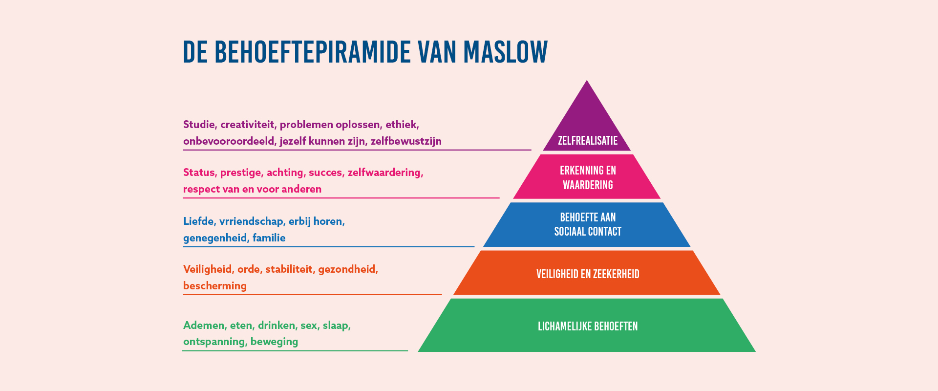 De wereldbekende psycholoog Abraham Maslow, grondlegger van de behoeftepiramide, heeft de universele behoeften hiërarchisch gerangschikt. Volgens zijn theorie zou de mens pas een stapje hoger in de behoeftepiramide terechtkomen, wanneer een onderliggende basisbehoefte is bevredigd. De behoefte aan veiligheid en liefde moet eerst voldaan zijn voor men zich verder kan ontwikkelen op sociaal vlak. Want een gebrek aan veiligheid en liefde stelt de mens niet in staat om op sociaal vlak volwaardig te functioneren. Concreet betekent dit dat mensen moeilijk kunnen liefde geven, als ze die zelf niet ontvangen hebben.