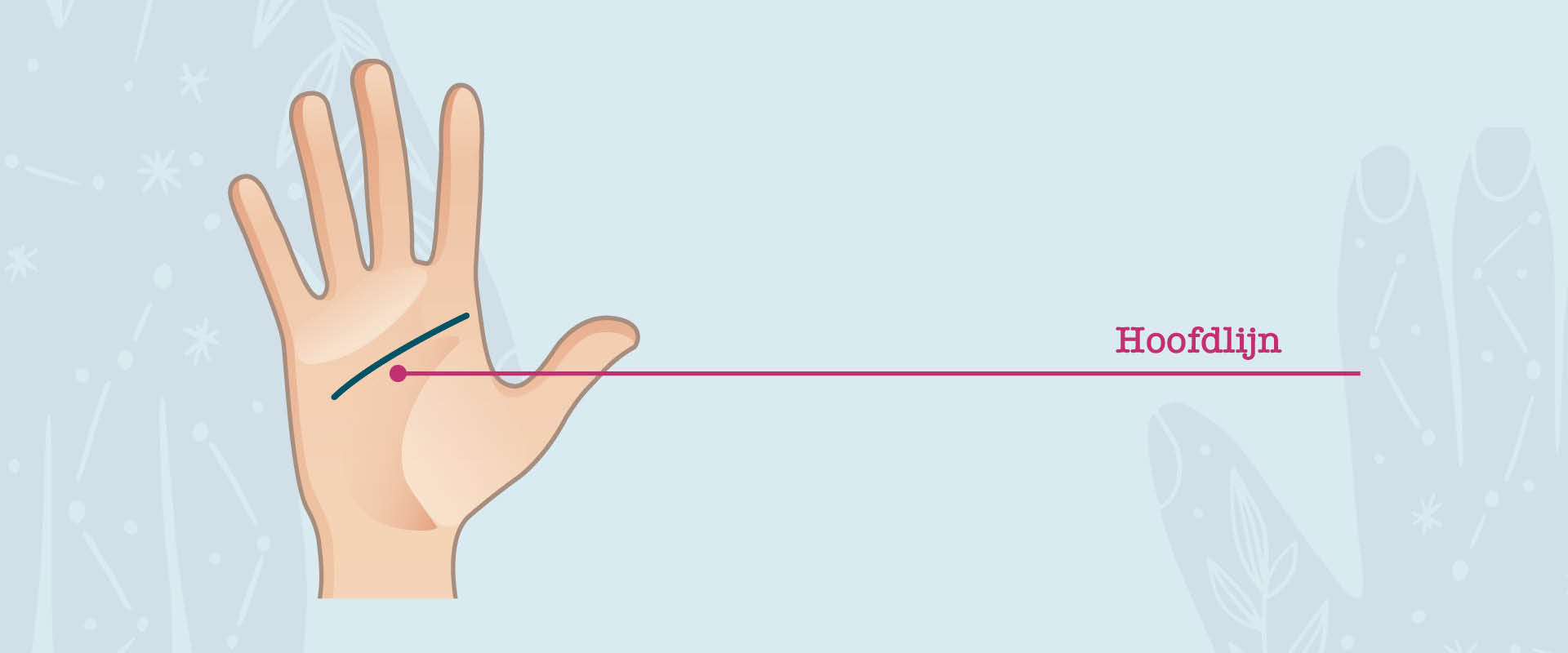 De hoofdlijn begint onder de wijsvinger en verdeelt de handpalm in twee onderdelen. De hoofdlijn wordt onderverdeeld in de levenslijn, de hoofdlijn en de hartlijn. De hoofdlijn ontsluiert alles wat zich in het hoofd afspeelt. Wanneer de hoofdlijn bijna horizontaal over de handpalm loopt, dan hebben we te maken met een zéér koele en egocentrische persoonlijkheid. Als de lijn echter geleidelijk afbuigt, dan maken we kennis met een gevoelige persoonlijkheid. Een dubbele hoofdlijn komen we tegen bij personen met een hoog IQ en bij mensen die hun geslepenheid misbruiken om anderen te manipuleren.