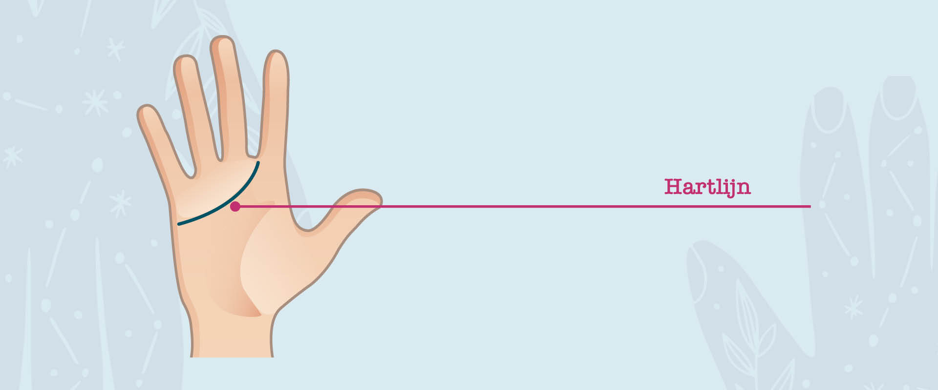 De derde hoofdlijn is de hartlijn. Die loopt vanaf de pink, boven de hoofdlijn, naar de wijsvinger. De hartlijn duidt storingen in de bloedsomloop aan, maar vertegenwoordigt ook teleurstellingen, situaties die ons hart ‘breken’.