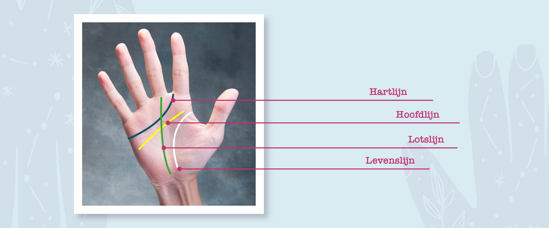 Wanneer je je handen wat gebogen houdt, dan worden de lijnen in de handpalm zichtbaar. Je ziet lijnen en bogen van verschillende breedte en lengte. Als je beide handen observeert, dan valt het op dat de lijnen in de linker- en rechterhand bijna gelijklopen. Omdat er toch verschillen bestaan, is het essentieel om beide handen nauwkeurig te onderzoeken. Zo vertelt onze linkerhand ons wat we geërfd hebben, en ontsluiert de rechterhand wat wij met onze erfelijke eigenschappen hebben gedaan. Bovendien is het belangrijk om te onthouden dat bij de linkerhand van een man de moederlijke karaktereigenschappen zichtbaar worden, bij de rechterhand de vaderlijke. Bij de handen van een vrouw is dat omgekeerd.