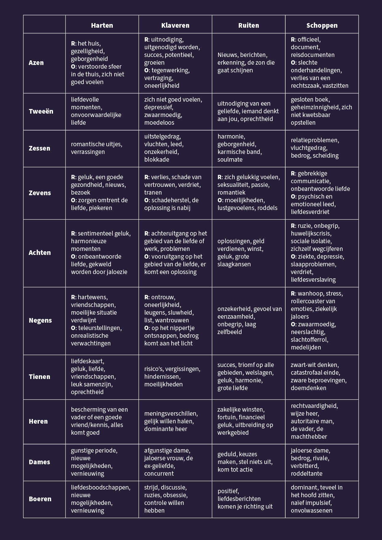 Per kaart kan je de sleutelwoorden terugvinden zodat ook jij de kunst van het kaartleggen met gewone speelkaarten onder de knie kunt krijgen.Sommige speelkaarten kunnen zowel rechtop (R) als omgekeerd (O) geduid worden. Ik geef daarbij enkele korte en krachtige sleutelwoorden, neem deze goed in je op.
