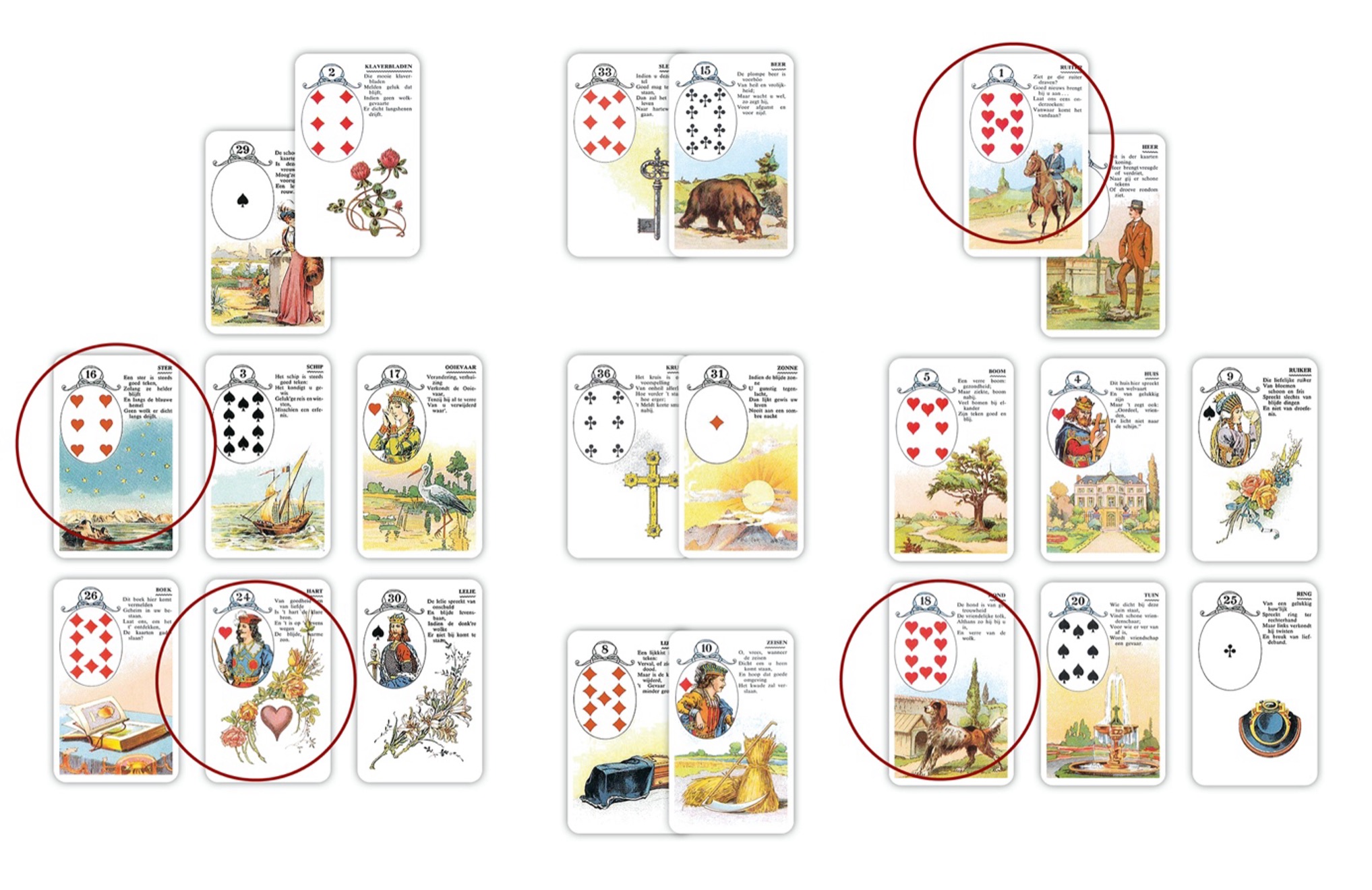 Let bij beide posities op herhalende thema’s, kaartkleuren (zoals harten) en de aanwezigheid van belangrijke Lenormandsymboliek zoals het Hart, de Ster of het Kruis.